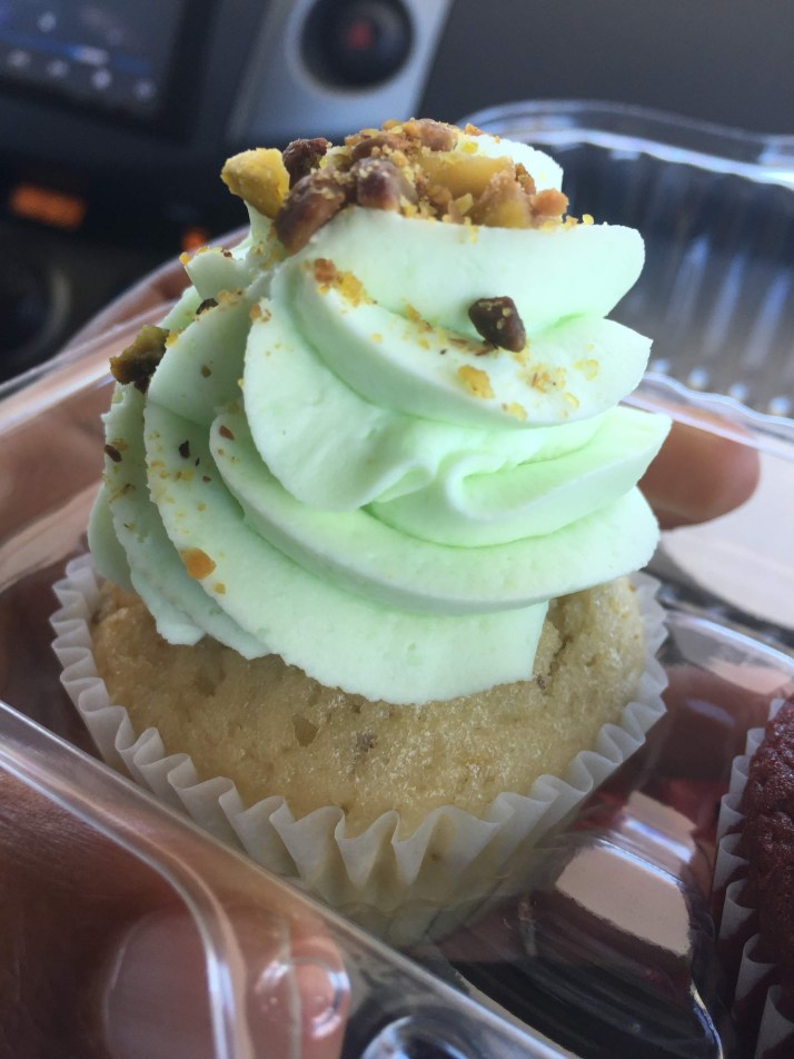 The pistachio cupcake had little pieces of pistachio nuts throughout the cake and was topped with a lightly pistachio flavored whipped cream. The flavors were not very intense. It tasted like it did not have enough flavor. In my opinion, either the topping or the cake needs to have a strong pistachio flavor. One or the other, but not both. Too much would it be overwhelming. In this both had very muted flavors.