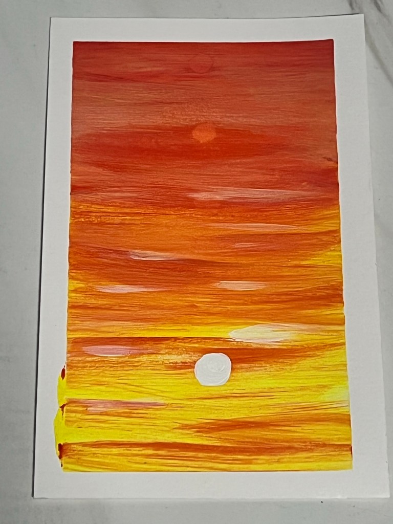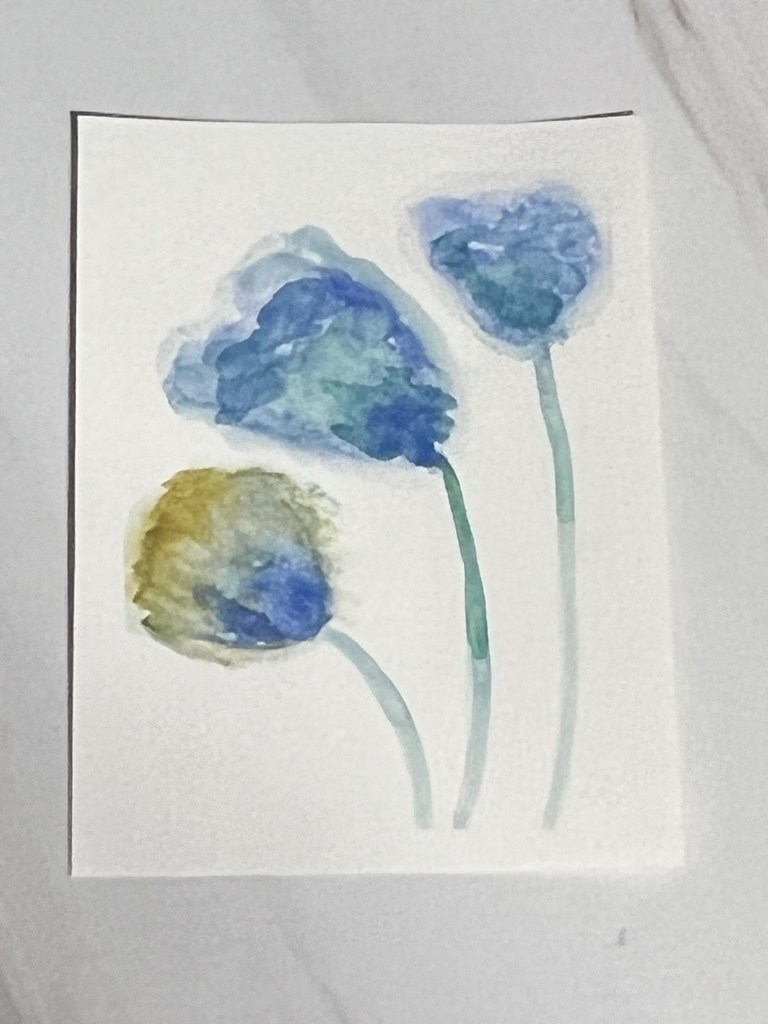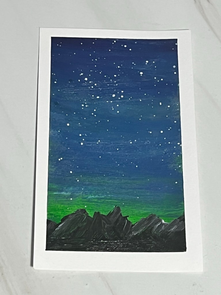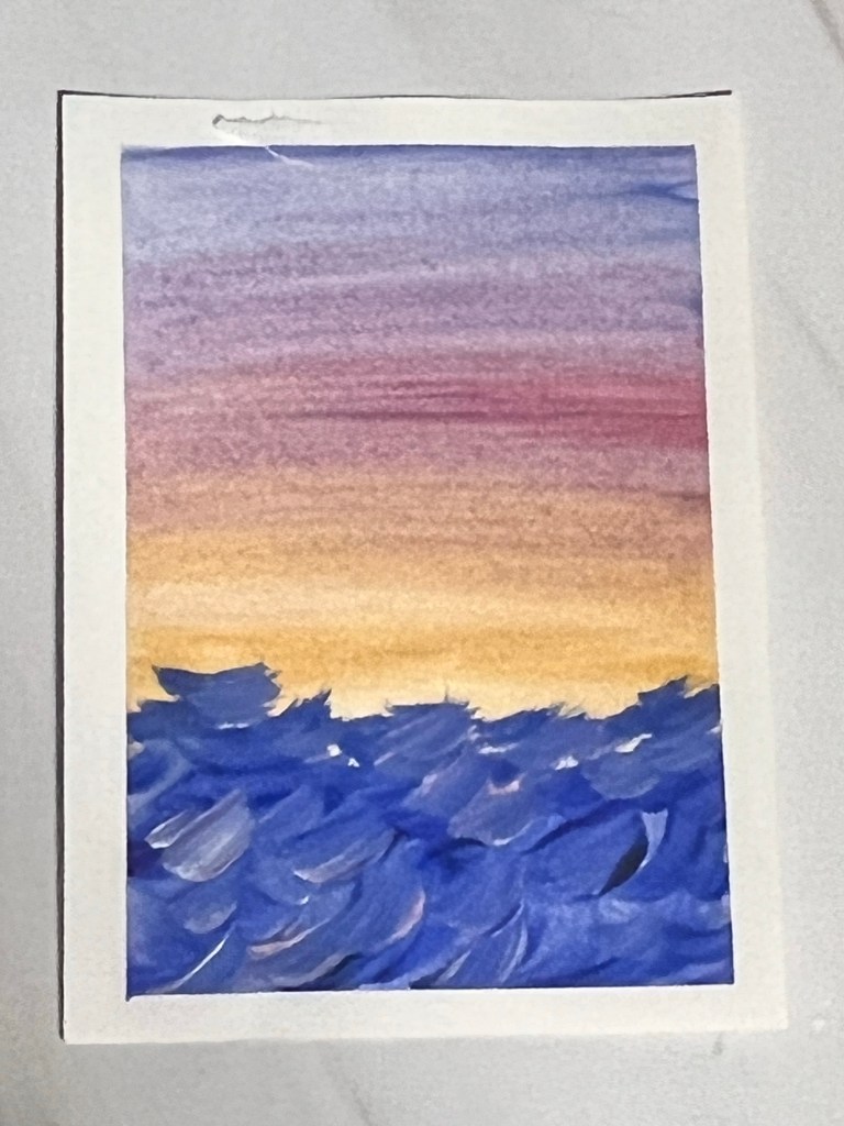 My preferred mediums are acrylics and watercolors. I like what I call “tiny refrigerator art”. These are small painting that you can share as a card or put on your fridge door to brighten your day!