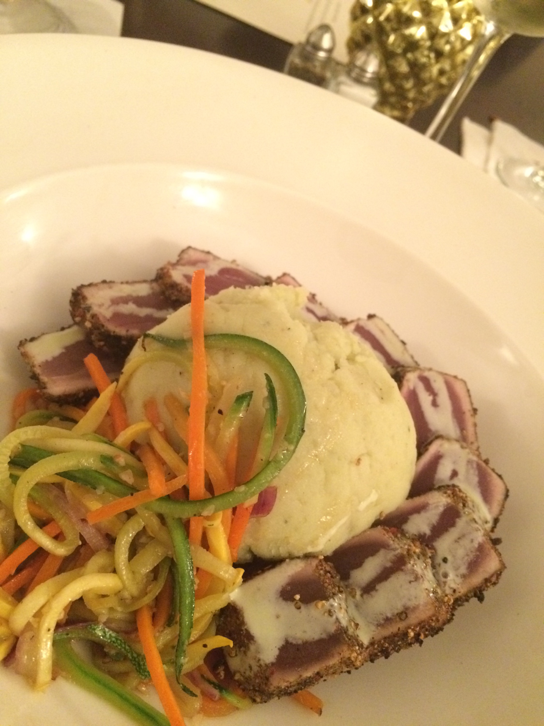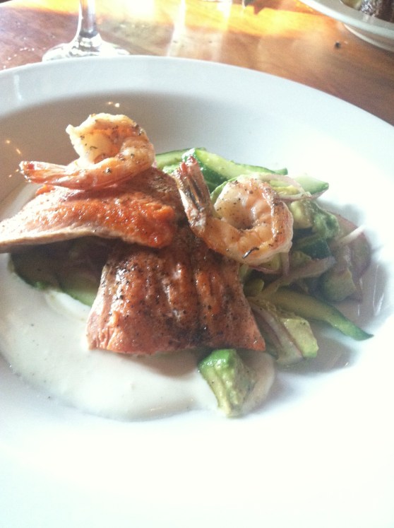 I ordered the salmon and shrimp over cucumber, avocado, and red onion with a cream sauce. Delicious. I thought it would not be filling, but I was wrong. If I had not been in an upscale restaurant, I might have given into the temptation to lick the plate.